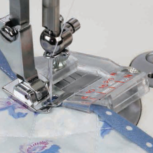 It is equipped with a small funnel to fold and guide the binding over the fabric edge before it reaches the needle and can be